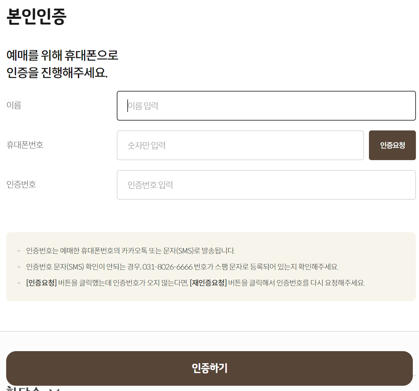 1. 입장권 예매하기 클릭 후 본인인증을 진행합니다.